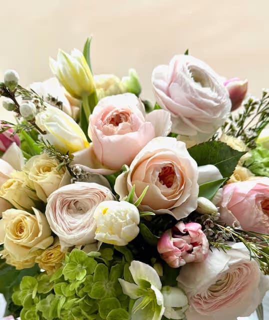 Premium blooms like peonies, garden roses, ranunculus, tulips, and hydrangea